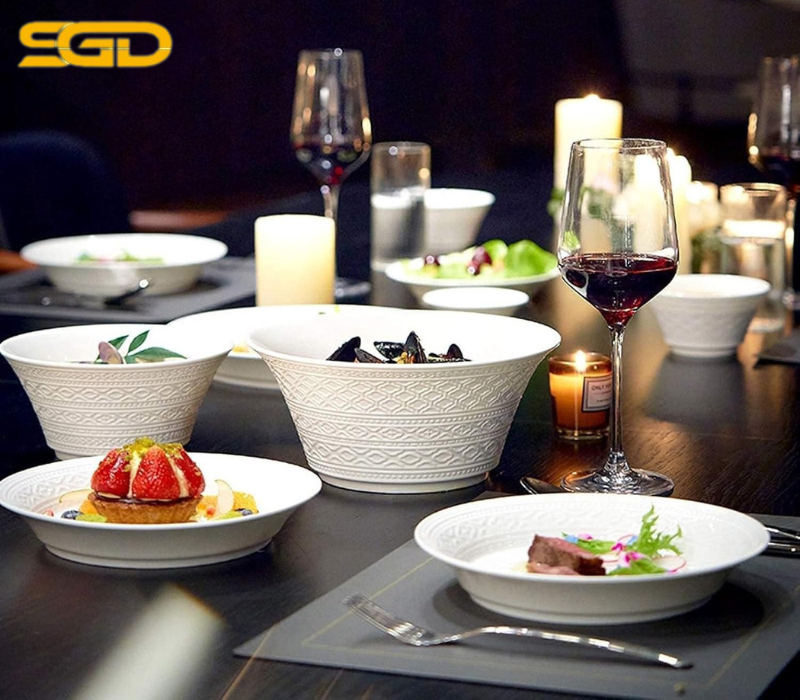 Phong cách cổ điển, trang trí độc đáo ở mép ngoài,những bông hoa dập nổi tinh tế và nhiều phụ kiện tạo nên một bộ đồ ăn không chỉ trang nhã mà còn đẹp sang.