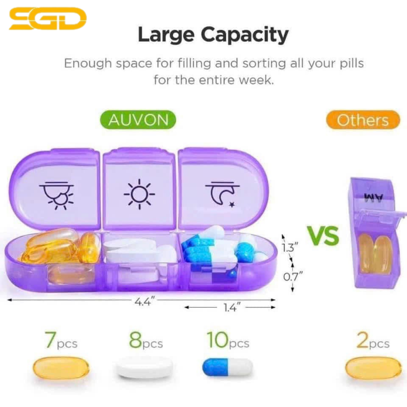 Sức chứa: 3 ngăn, mỗi ngăn đựng 10–15 viên thuốc hoặc vitamin